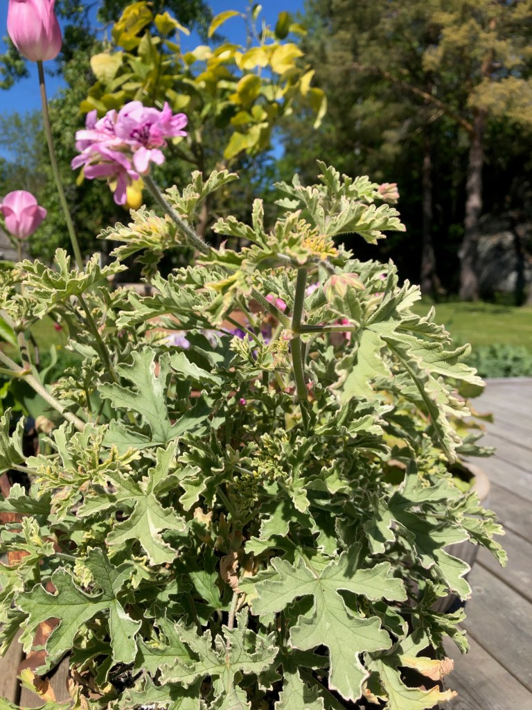 De duftende geranier, eller rosengeranier, som ved berøring fyller et rom med rose, sitron, balsam, eple eller muskat er lettere å tåle, og i potte er de til å hanskes med. De fleste er ikke herdige, men hviler godt i et kaldt drivhus eller en kjølig vinduskarm gjennom vinteren. Som denne, Lady Plymouth, duftende og nokså skjønn også, ikke for blomstenes skyld kanskje, med med den hvite randen på bladene er den alltid verdt å se på en stund.