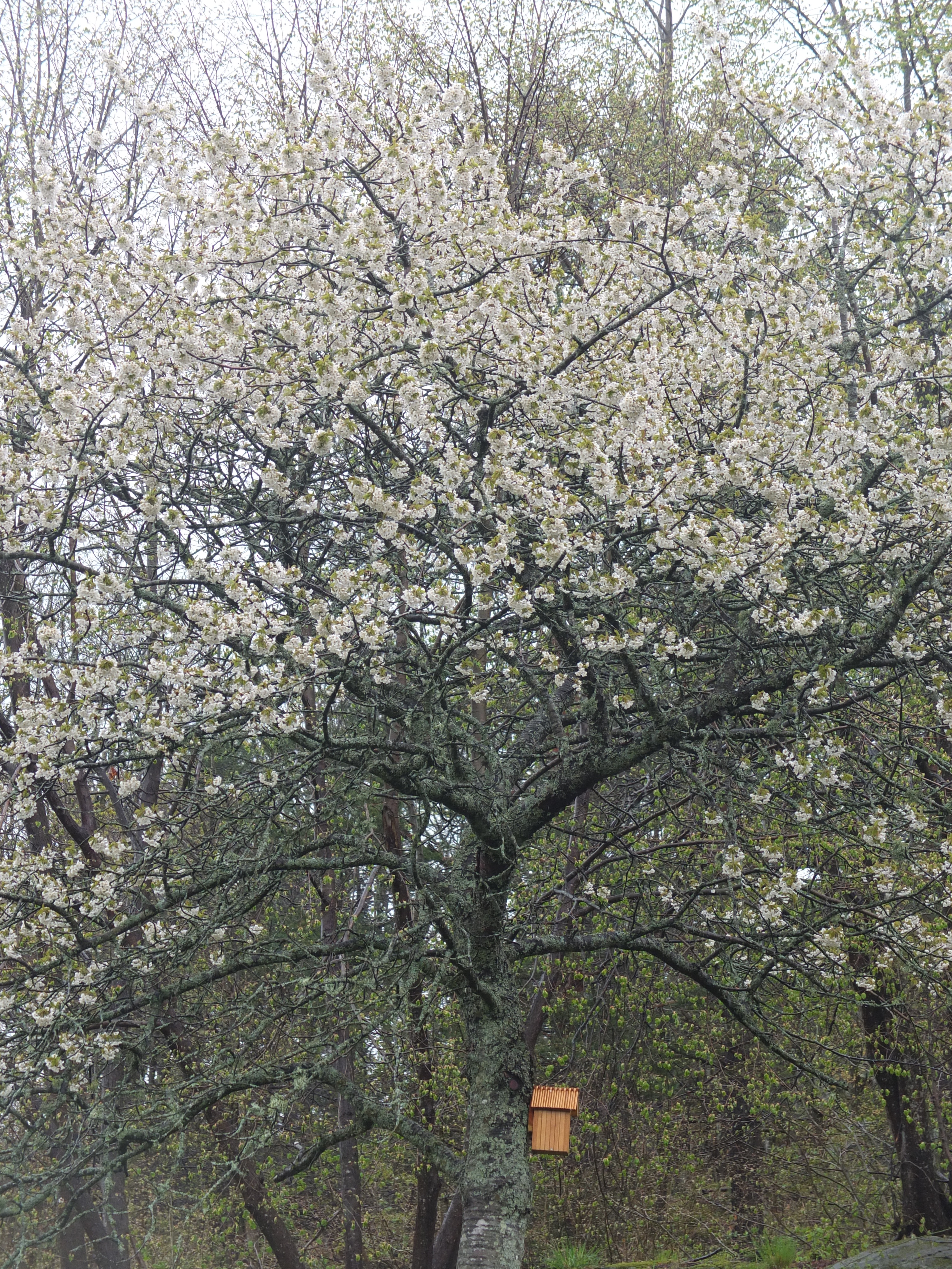 Det har tatt to dager. En varm en og en med regn. Mye regn. Nå er alt grønt. Gresset, frukttrærne, skogen. Det har tatt bare to dager. Plommetreet ved sydveggen, og kirsebærtreet som står der Afrika begynner, blomstrer. Pæretrærne kvier seg. Hadde tenkt å springe ut, men så kom regn, så de venter på sol. Venter til humler og bier ikke er redde for å drukne og kommer fram fra gjemmestedene sine. Venter under den knudrete barken. Epletrærne også. I mellomtida drikker de. Vann drikker de. Merker vannet og drikker. Merker ikke annet. Det er lett å se på dem at de liker det. De er ikke på Yr, men jeg tror de vet at om et par dager blir det sol igjen. Og varmere. De venter også på det. Som meg. På sol i regn.