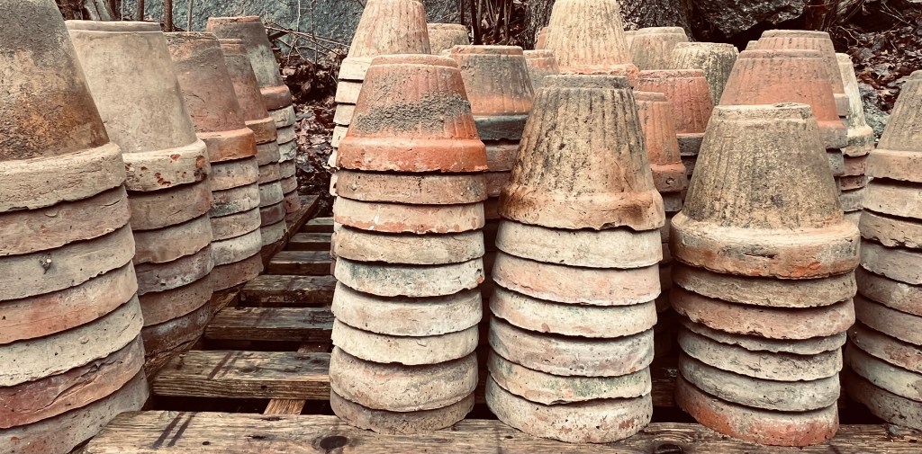 Har en god del håndlagde potter fra Pot Ole i flere størrelser, noen kurver og melkeboller og annet smått fra Marokko og frø til valmuer til givandes.
