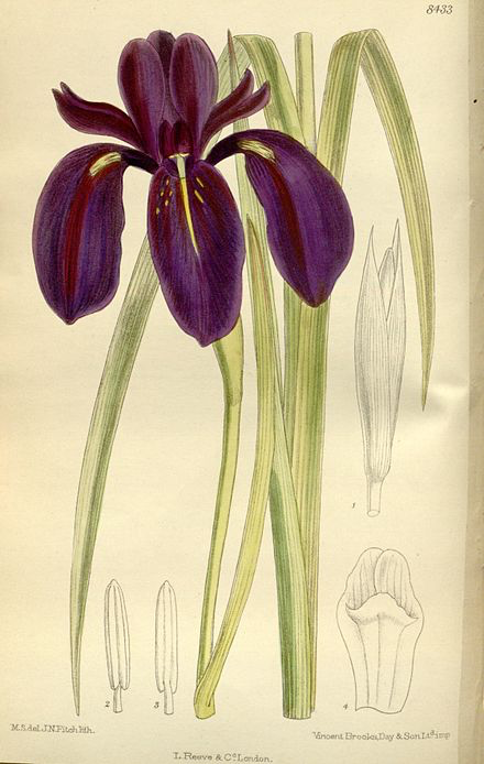 Iris chrysographes, black form, eller sort iris kommer fra Kina. Vokser på jorder, langs elver og i skogkanter. Vil helst ikke tørke ut… Og kan godt stå i halvskygge. Står med andre ord ikke helt optimalt der jeg har plantet den. Burde stått der siget går forbi brønnen kanskje, men den får stå der den står inntil videre. Passe på den og vanne så den vokser på seg og kan deles. Og flyttes. En annen vår.