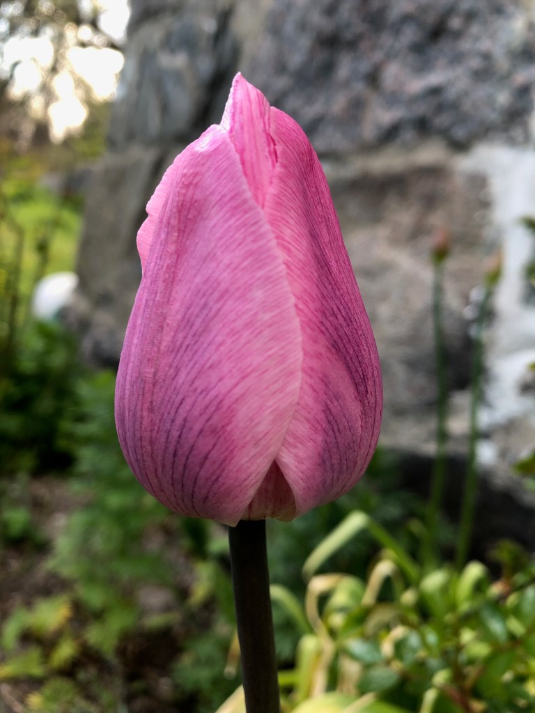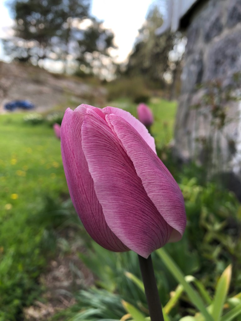 Det sto noen tulipaner i Bellas hage som må ha kommet igjen og igjen i årevis, like høye og sunne som da de ble plantet. For alt jeg vet kan de ha stått i femti år, i hvert fall i tjue, i noe som en gang har vært bed, men var eng da vi flyttet inn. Nå er tulipanene gravd opp, befridd fra løvetann, kløver og gras, flyttet til varmen langs veggen mot sør. Der står de sammen med roser, klematis, kirgisløk og liljer. Godt selskap med andre ord. Når jeg går forbi setter jeg meg ned og studerer kronbladene, beundrer dem, og lurer på hvorfor så mange moderne tulipaner ikke greier seg mer enn et par tre år før de slutter å blomstre. Jeg merker at jeg kan klarer meg fint med de som har overlevd her i hagen. Jeg trenger ingen andre. Jeg trenger bare rosa tulipaner.